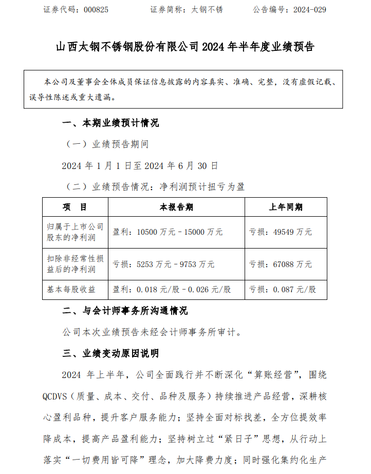 太鋼不銹(000825)7月9日晚間披露業績預告,預計2024年上半年歸母凈利潤1.05億元至1.5億元,上年同期虧損4.95億元;扣非凈利潤虧損5253萬元至9753萬元,上年同期虧損6.71億元;基本每股收益0.018元/股-0.026元/股。